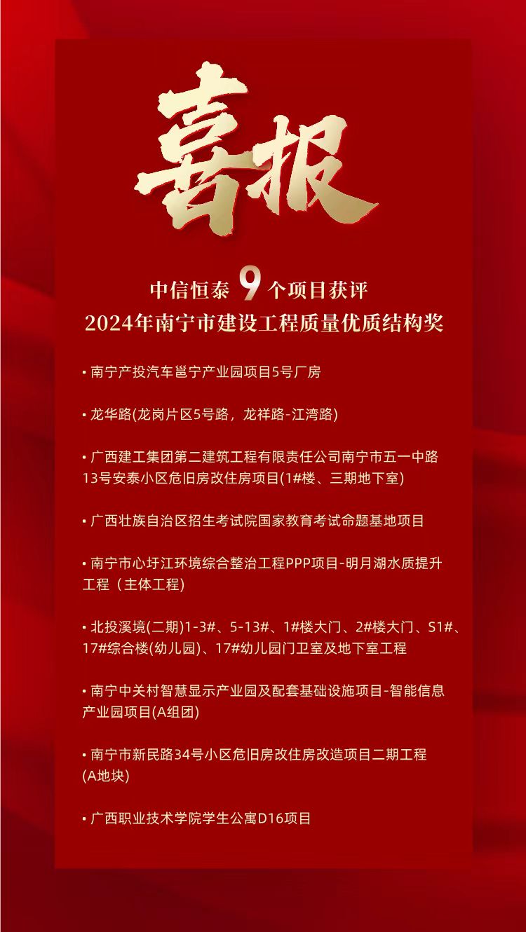 喜讯 | 中信恒泰9个项目荣获2024年第一����� �������Ƴ������������ �������Ƴ������������ �������Ƴ������������ �������Ƴ�������批南宁市建设工程质量优质结构����� �������Ƴ����������� �������Ƴ������������ �������Ƴ������������ �������Ƴ�������奖