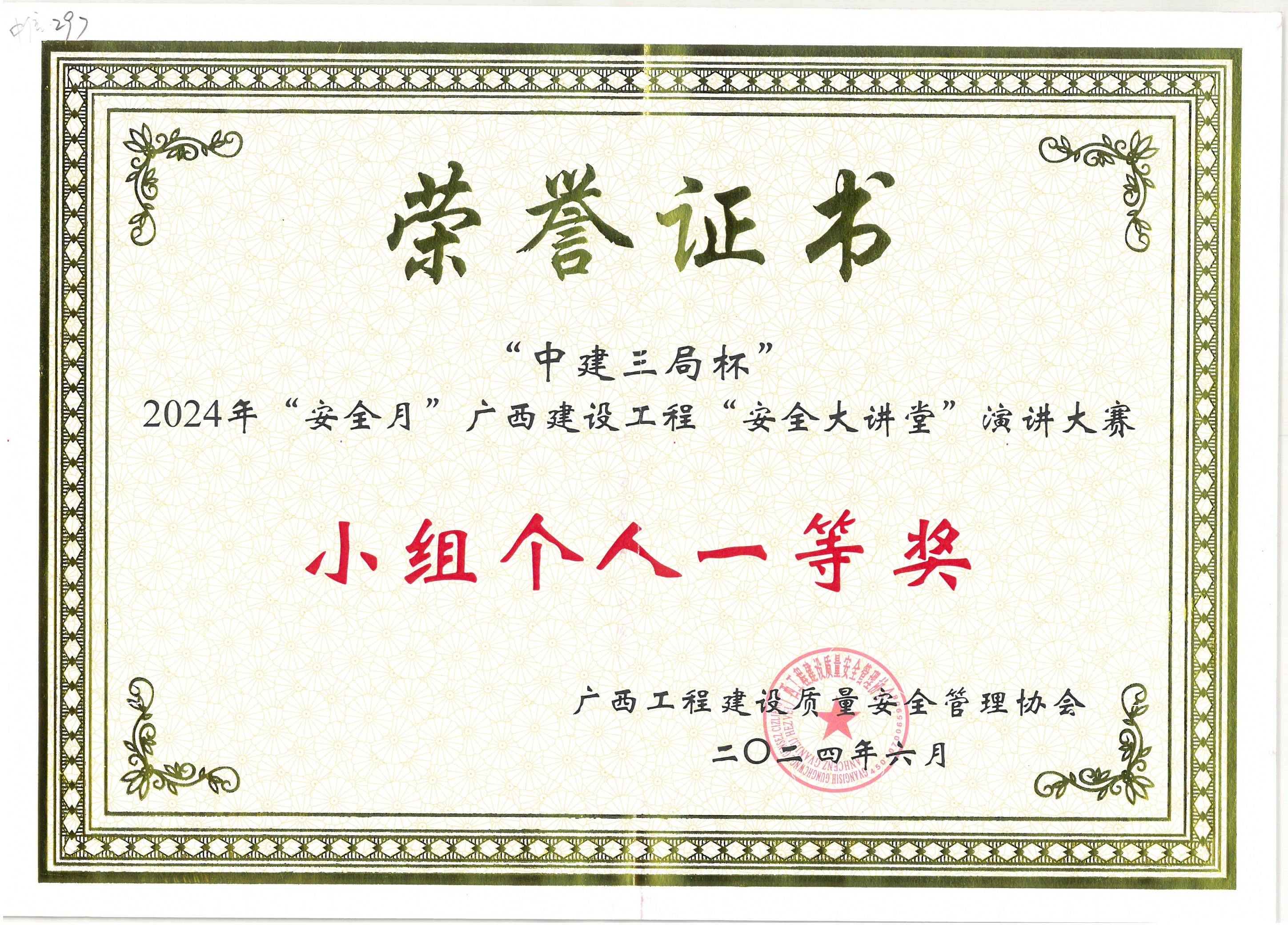 “中建三局杯”2024年“安全月”广西建设工程“����� �������Ƴ������������ �������Ƴ����������� �������Ƴ������������ �������Ƴ�������安全大讲堂”演讲大赛-小组个人一等奖